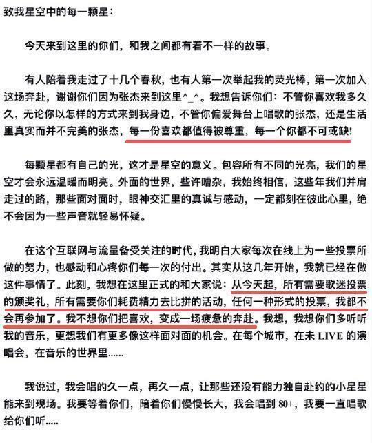 张杰在成都演唱会上,宣布永久退出所有需要粉丝投票的奖项竞争。他说,不想让喜欢变成疲惫的奔赴。