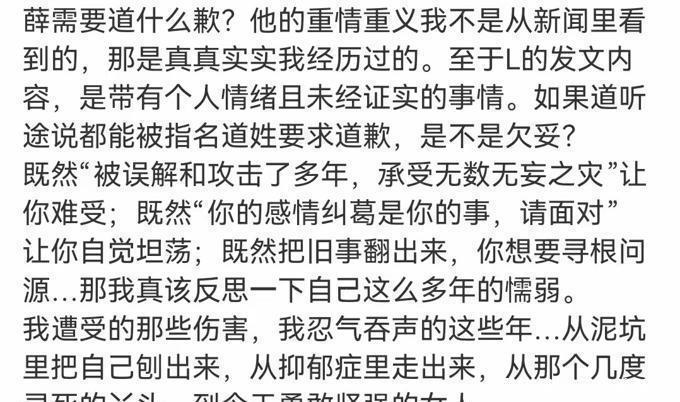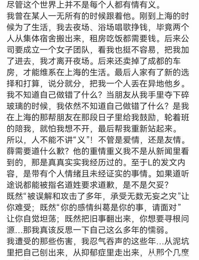 她在文章中坚决支持薛之谦,表示他的忠诚和义气是她"真实经历过的"。薛之谦当年并未走红,但他独立承担了公司的重任,养活了一群兄弟姐妹,并坚持到最后一次解约,以保护朋友的利益,这份恩情她铭记了二十年