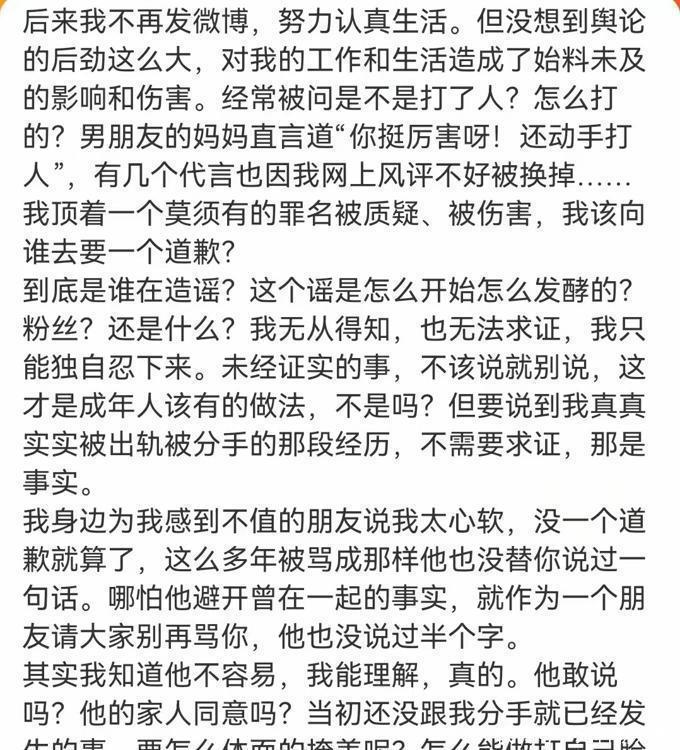 令她更加失望的是,分手之后,她不仅遭到了断崖式的遗弃,还被贴上了毫无根据的恶名。网络上疯传她在后台给谢娜一巴掌,从此她被贴上了“疯女人”和“第三者”的标签。她的微博被粉丝冲毁,代言被取消,甚至她的男友和母亲都质疑她“是不是动手打了人”。张杰一直看在眼里,但从未站出来为她说过一句话