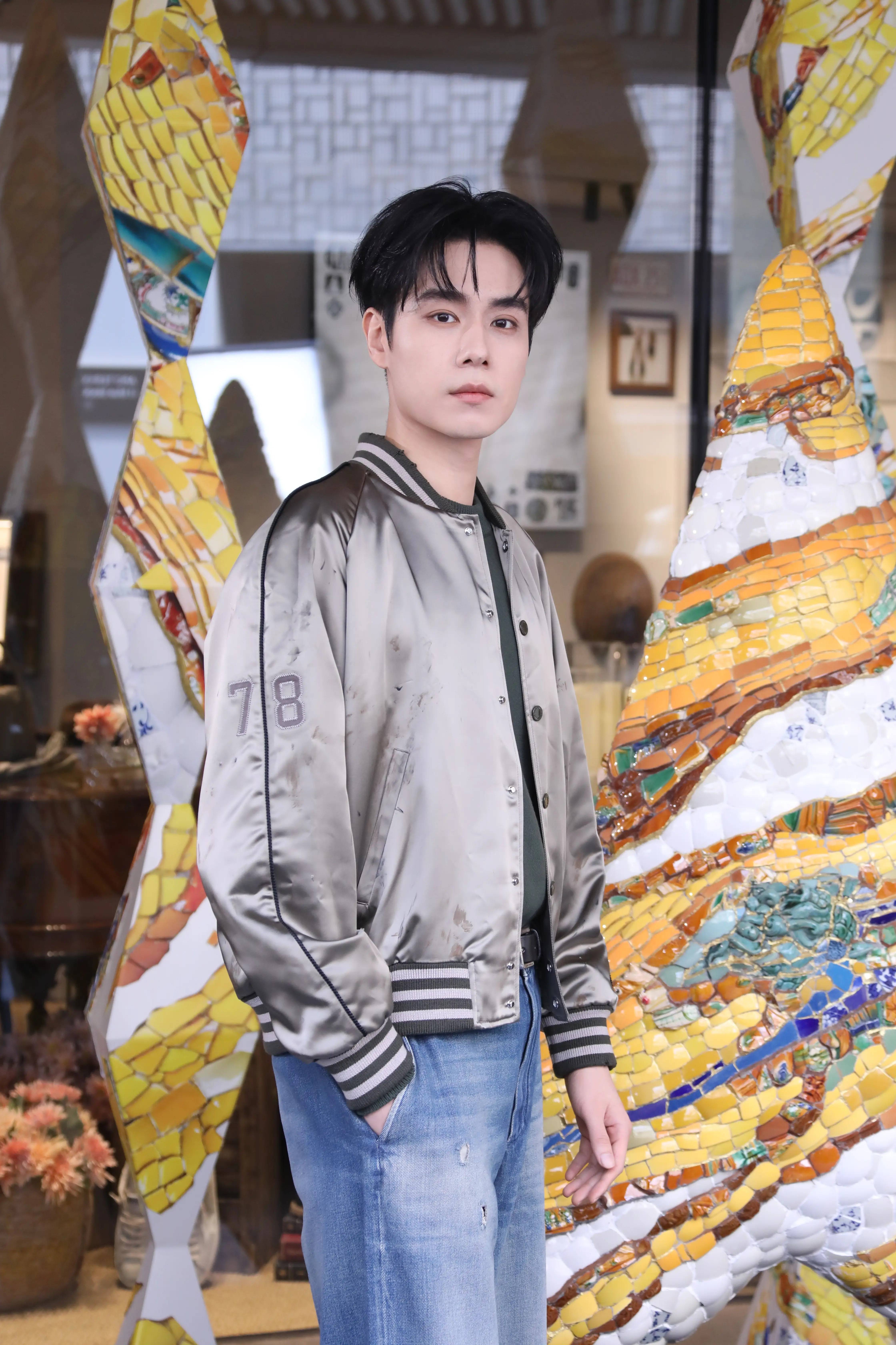 4 月 15 日,胡一天现身某品牌活动,造型清爽吸睛。他身着银灰缎面复古飞行夹克,内搭深色基础款上衣,搭配做旧阔腿牛仔裤与简约休闲鞋,整体穿搭随性又不失质感。站定镜头前时,他眉眼清冷、气质俊朗,将休闲与时髦感平衡得恰到好处。